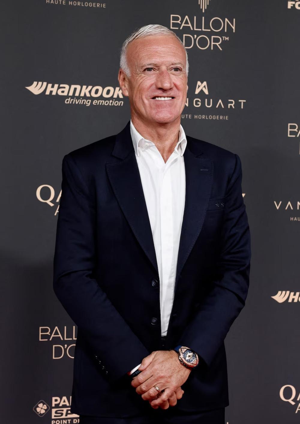 Didier Deschamps eligió un traje de color azul marino, con una chaqueta de solapas clásicas y una camisa blanca sin corbata. De accesorio llevó un reloj de pulsera metálico.