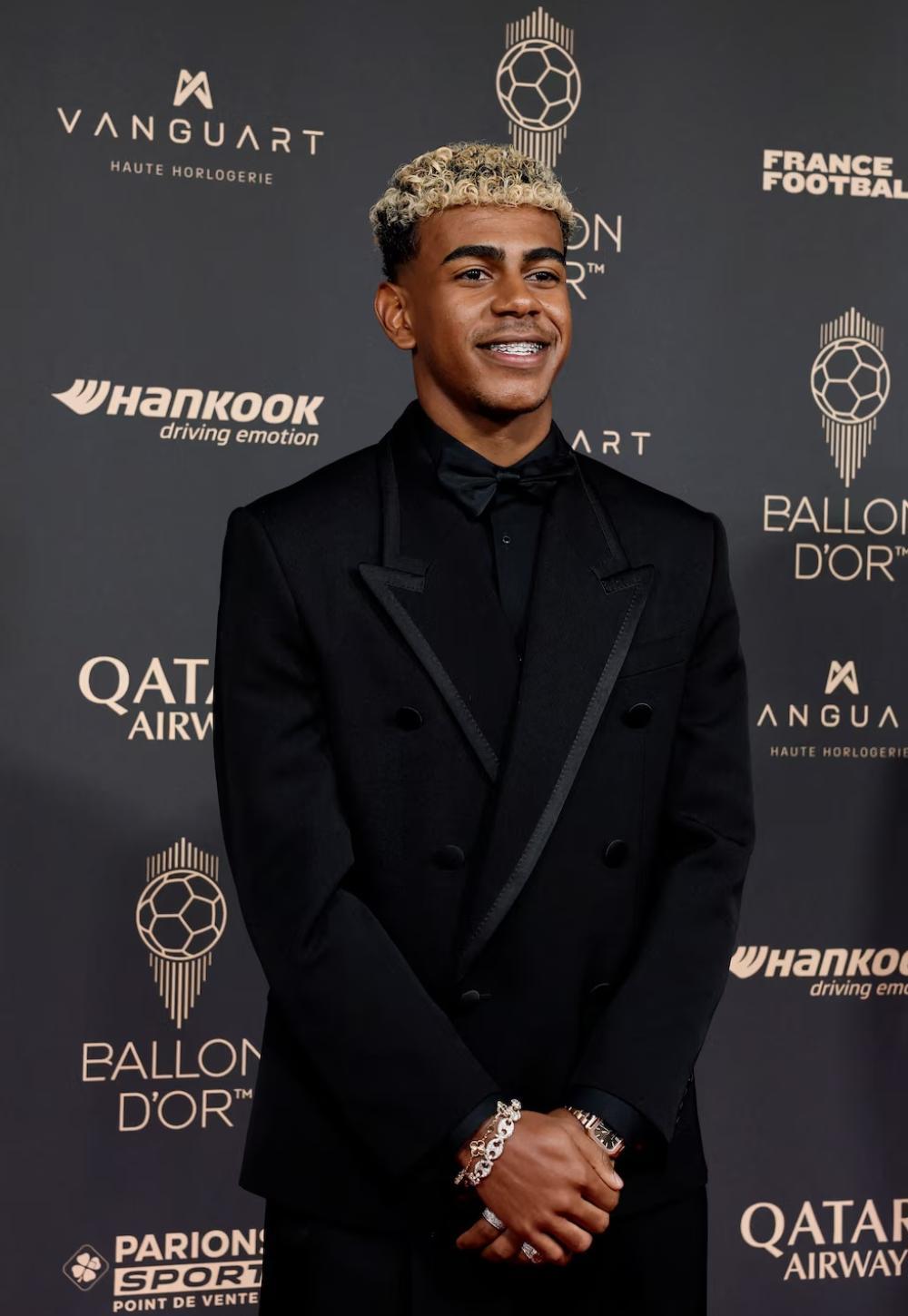 El joven delantero español eligió un esmoquin negro de corte clásico, con camisa negra sin corbata que le dio un aire fresco y contemporáneo. Los accesorios plateados sumaron el toque justo de brillo.