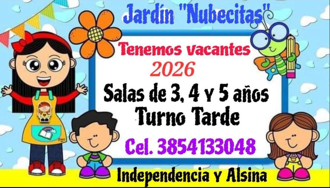 El Jardín N°26 "Nubecitas", ubicado en calle Independencia y Alsina de la ciudad Capital, informa a la comunidad santiagueña que se encuentran abiertas las vacantes para el ciclo lectivo 2026.