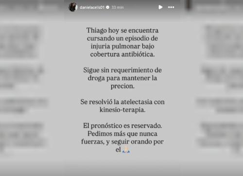 Asimismo, la madre de las hijas de Thiago y también ex participante de Gran Hermano, reveló que Medina continúa "sin requerimiento de drogas para mantener la presión". Al tiempo en que destacó la evolución de su salud.