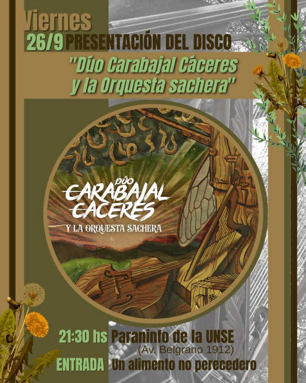 En un contexto donde la música popular santiagueña sigue conquistando nuevos escenarios, este viernes 26 de septiembre a las 21:30 horas, el Paraninfo de la UNSE, será testigo de un acontecimiento histórico: la presentación oficial del disco "Dúo Carabajal Cáceres y la Orquesta Sachera", un proyecto que no solo celebra la música, sino que pone en valor y reivindica el legado de las orquestas tradicionales de Santiago del Estero, con su estilo único, vibrante y profundamente arraigado en la identidad provincial.