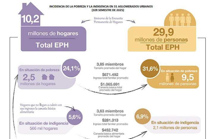 En la pobreza están 2.456.090 hogares, con 9.451.018 personas. En ese total, hay 2.051.984 personas indigentes.