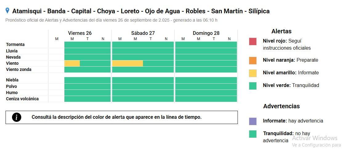 A partir del viernes 26 por la noche, el norte de La Pampa, noroeste de la Provincia de Buenos Aires, oeste de Santa Fe, Córdoba y sur de Santiago del Estero ( Atamisqui - Banda - Capital - Choya - Loreto - Ojo de Agua - Robles - San Martín - Silípica) serán afectados por vientos del sector sur con velocidades entre 35 y 55 km/h, y ráfagas que pueden alcanzar localmente los 90 km/h.