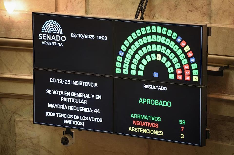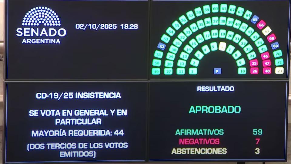 Los vetos de este jueves fueron debatidos de forma conjunta; la definición, separada. Por un lado, la emergencia pediátrica obtuvo 59 votos positivos, siete negativos y tres abstenciones -de los macristas Alfredo De Ángeli, Martín Goerling y Victoria Huala- sobre un total de x presentes. En tanto, la iniciativa relacionada con universidades consiguió 58 adhesiones, siete rechazos y las mismas tres abstenciones del Pro, más la radical Carolina Losada. Es decir, ambos textos lograron -bajo la mirada de la vicepresidenta y titular de la Cámara alta, Victoria Villarruel-, por amplio margen, los dos tercios que requieren las leyes para ser insistidas por el Congreso.