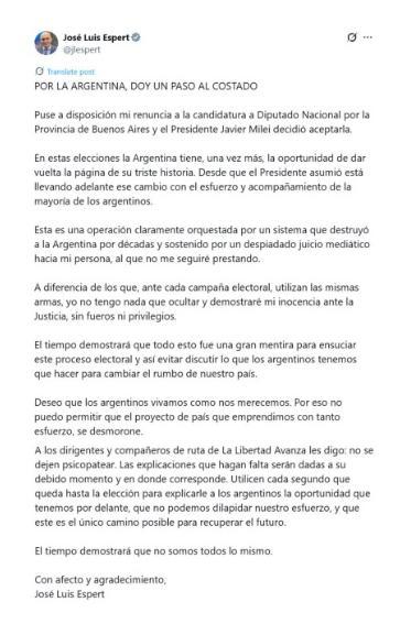 El economista confirmó su decisión a través de un mensaje publicado en la red social X, donde informó que presentó la dimisión al presidente Javier Milei, quien resolvió aceptarla. "Demostraré mi inocencia en la Justicia, sin fueros ni privilegios", expresó Espert en un extenso texto difundido en la plataforma.