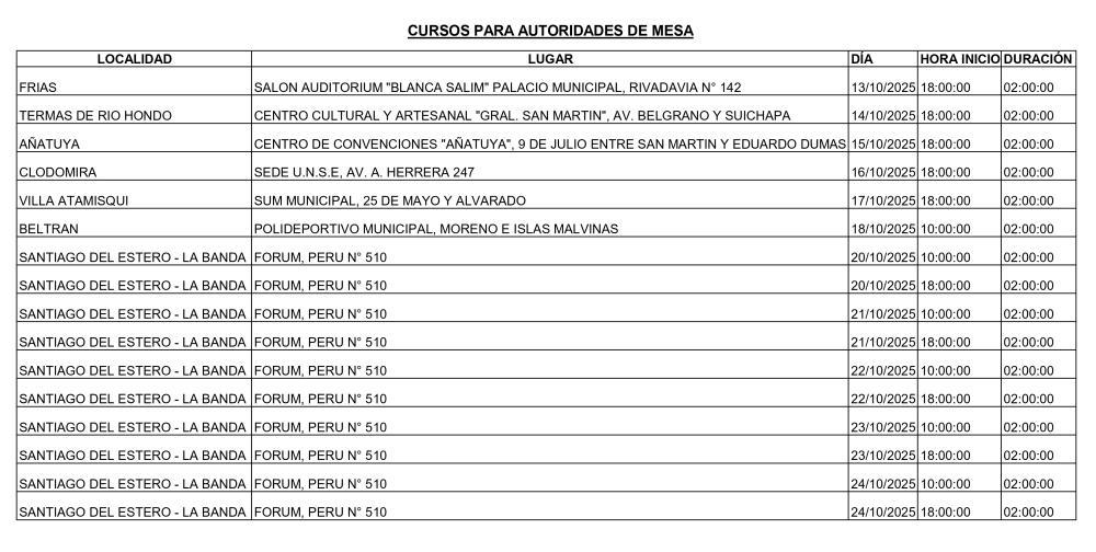 De acuerdo con lo informado, las capacitaciones se realizarán en ciudades como Termas de Río Hondo, Frías, Añatuya, Beltrán, Clodomira, Villa Atamisqui y Santiago del Estero capital. Entre los lugares establecidos se encuentran el Salón Auditorium "Blanca Salim" del Palacio Municipal de Frías, el Centro Cultural San Martín en Termas, el Centro Cultural Añatuya y el Fórum en la ciudad Capital, entre otros. Los encuentros iniciarán el 13 de octubre y se extenderán hasta el 24 del mismo mes, con horarios programados a partir de las 18 horas.