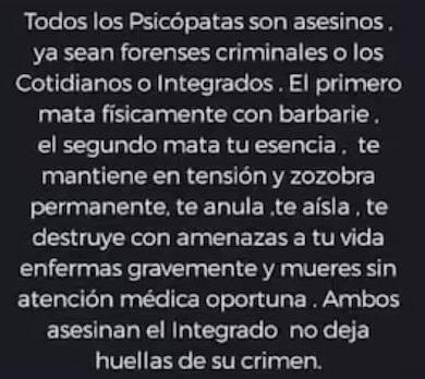 "Todos los psicópatas son asesinos", había publicado la joven en su cuenta de Facebook en febrero del año pasado. En otro posteo más reciente, escribió: "Por tu propia salud mental, tomá las señales confusas de las personas como un rotundo no".