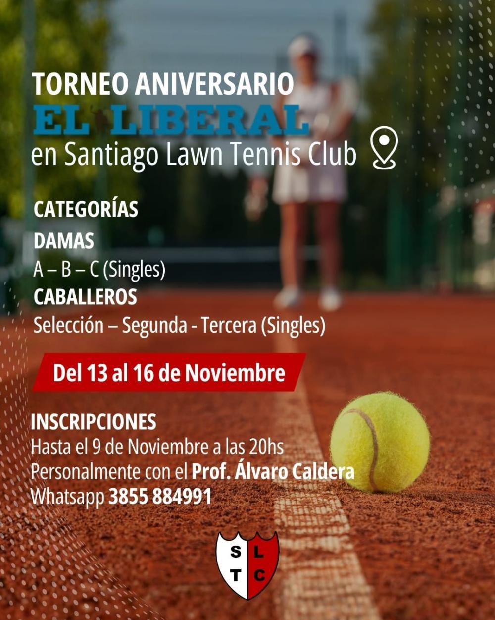 Durante el mes de noviembre se desarrollará en el Santiago Lawn Tenis Club el ya tradicional torneo Aniversario del Diario El Liberal, siendo el evento más esperado por todos los amantes del tenis. Podrán participar damas y caballeros en las distintas categorías.