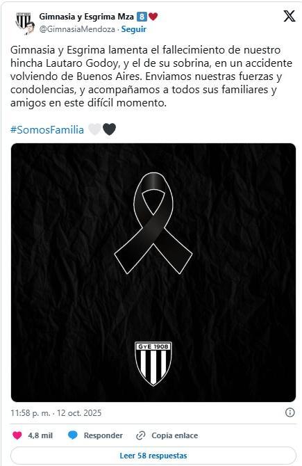 A través de un comunicado en sus redes sociales, Gimnasia y Esgrima de Mendoza expresó su profundo pesar: "Gimnasia y Esgrima lamenta el fallecimiento de nuestro hincha Lautaro Godoy y el de su sobrina, en un accidente volviendo de Buenos Aires. Enviamos nuestras fuerzas y condolencias, y acompañamos a todos sus familiares y amigos en este difícil momento".