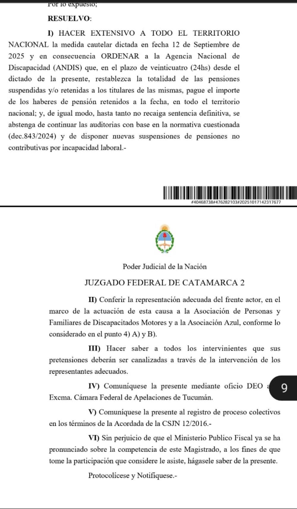 La Justicia Federal de Catamarca, en virtud de la causa incoada bajo Expediente Nro. 13578 / 2025 caratulado: Defensor del Pueblo y Otros contra la ANDIS sobre una Acción de Amparo en trámite ante este Tribunal, se dictó la siguiente resolución: "HACER EXTENSIVO A TODO EL TERRITORIO NACIONAL la medida cautelar dictada en fecha 12 de Septiembre de 2025 y en consecuencia ORDENAR a la Agencia Nacional de Discapacidad (ANDIS) que, en el plazo de veinticuatro (24hs) desde el dictado de la presente, restablezca la totalidad de las pensiones suspendidas y/o retenidas a los titulares de las mismas, pague el importe de los haberes de pensión retenidos a la fecha, en todo el territorio nacional; y, de igual modo, hasta tanto no recaiga sentencia definitiva, se abstenga de continuar las auditorias con base en la normativa cuestionada (dec.843/2024) y de disponer nuevas suspensiones de pensiones no contributivas por incapacidad laboral.-