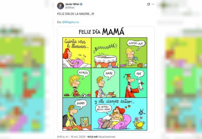 El presidente Javier Milei saludó este domingo a las madres en su día y utilizó una viñeta del dibujante Nik Gaturro, alienado con la administración libertaria, para felicitar a todas las madres del país.