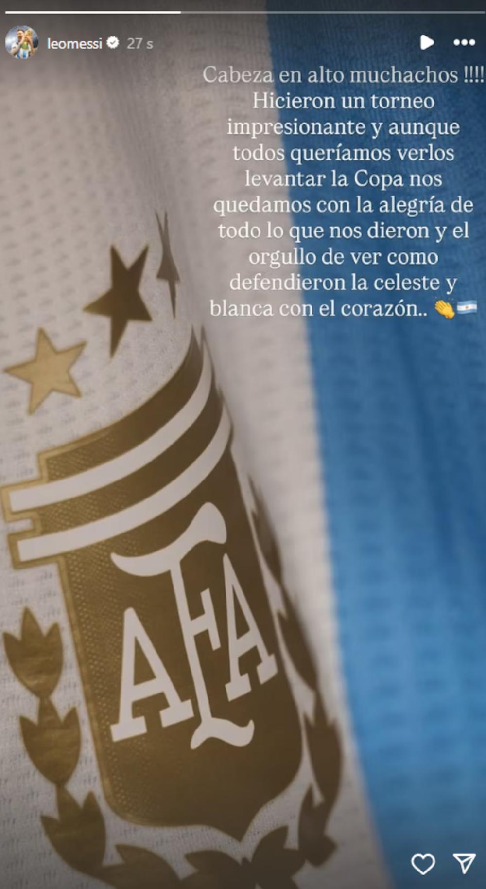 "Cabeza en alto muchachos. Hicieron un torneo impresionante y, aunque todos queríamos verlos levantar la Copa, nos quedamos con la alegría de todo lo que nos dieron y el orgullo de ver cómo defendieron la celeste y blanca con el corazón", escribió Messi en una historia publicada en su cuenta de Instagram.