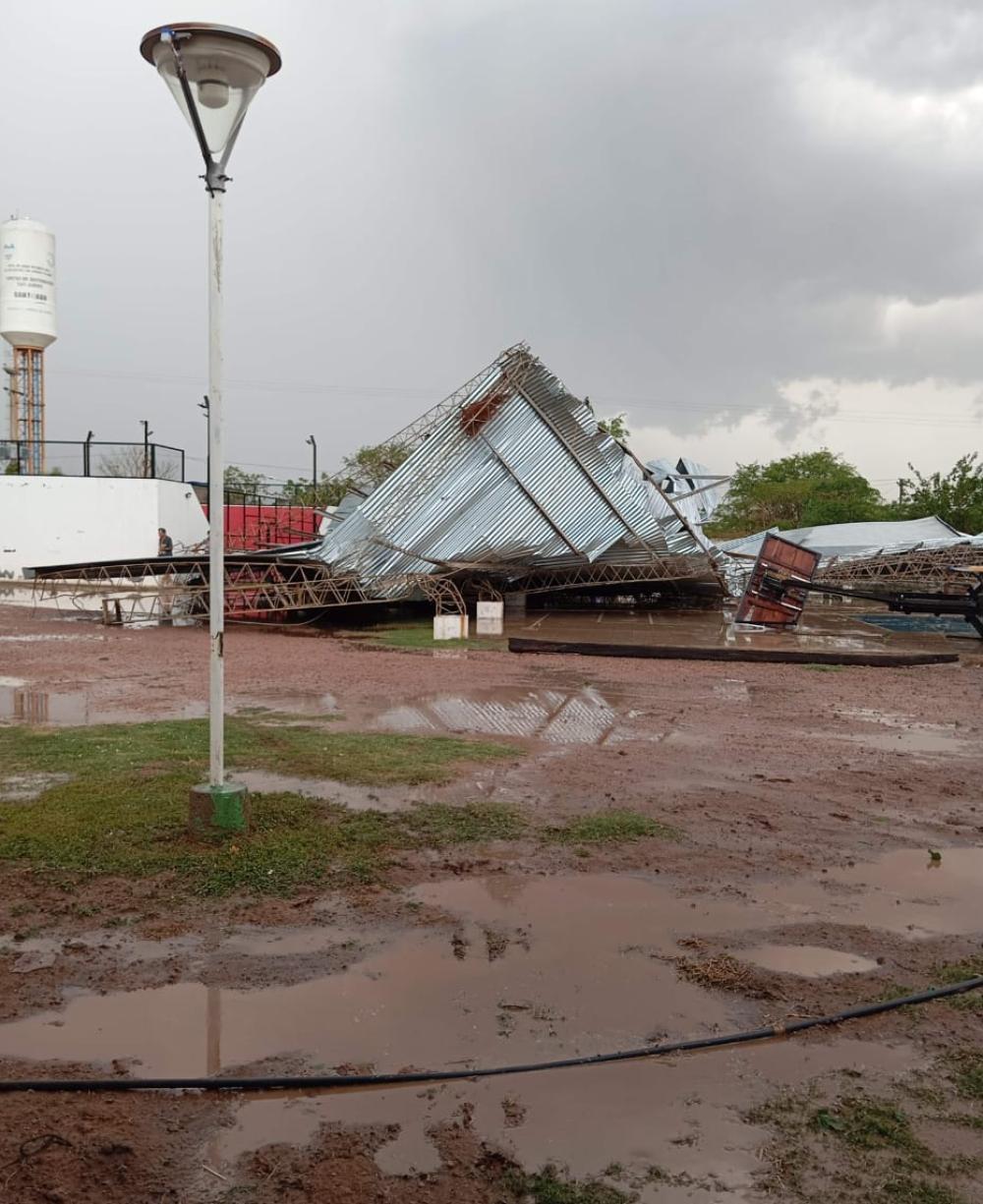 Las fuertes ráfagas de viento, acompañadas por lluvia y caída de granizo, provocaron la voladura del techo de la cancha de básquet del Polideportivo Municipal, donde en ese momento alumnas de la escuela de patín practicaban junto a su instructora, Yvanna Farías.