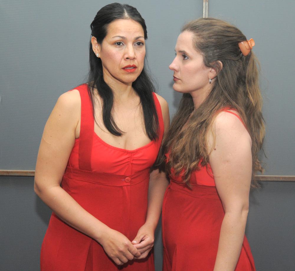 No sé si simbólico, o sea, se habla sobre lo que sucede. Por ahí el color en el vestuario (rojo) quizás dé algún significado desde ese lado, pero ya de por sí el texto dice, las miradas, las acciones dicen. Entonces, es una puesta o es una obra a puro actor, en este caso a pura actriz.