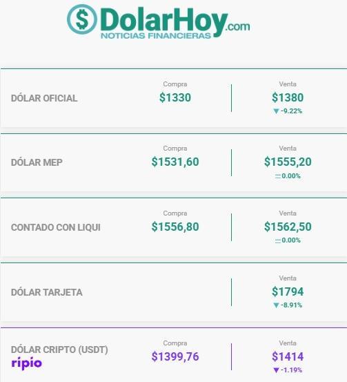 El dólar oficial se hunde este lunes tras la victoria contundente de Javier Milei en las elecciones legislativas. El dólar minorista en el Banco Nación cede $135 y se vende a $1.380. Por otro lado, el dólar cripto cede y se vende a $1.414.
