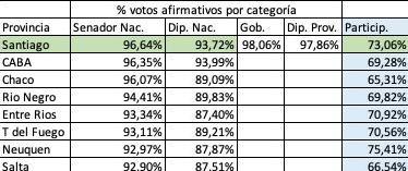 En porcentaje de votos afirmativos, Santiago del Estero alcanzó en la categoría senador nacional el 96,64%; en diputados nacionales 93,72%; en gobernador 98,06%; en diputados provinciales 97,86% (73,06% de participación del electorado).