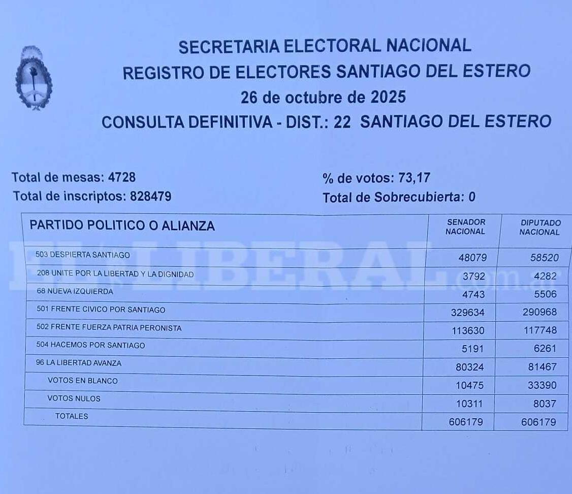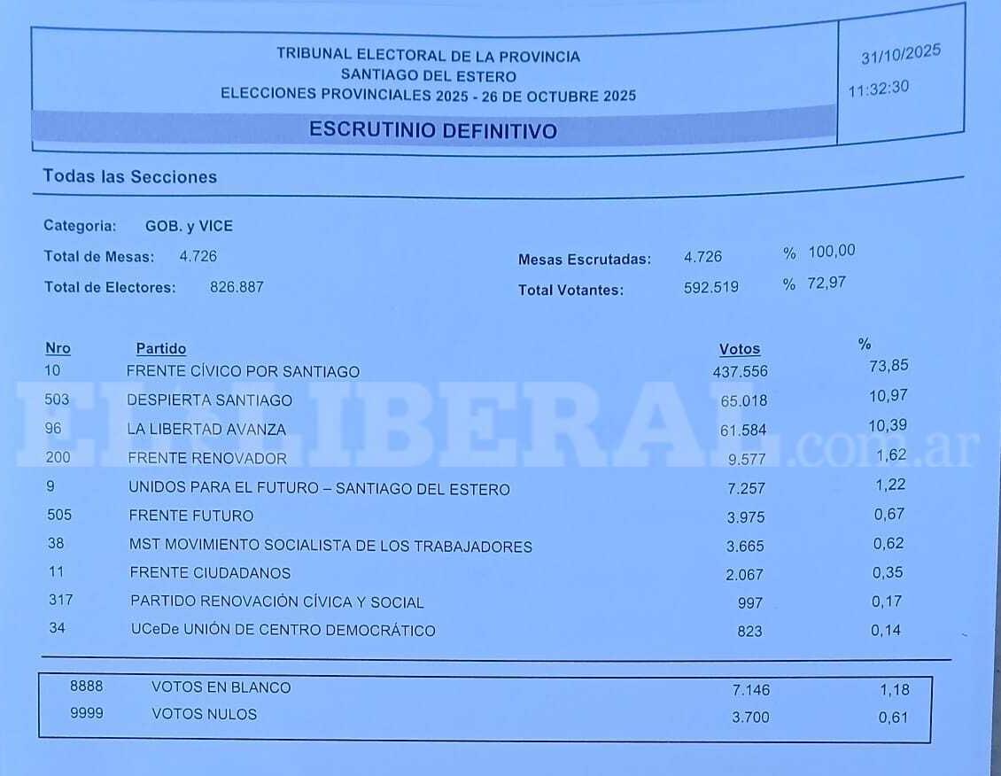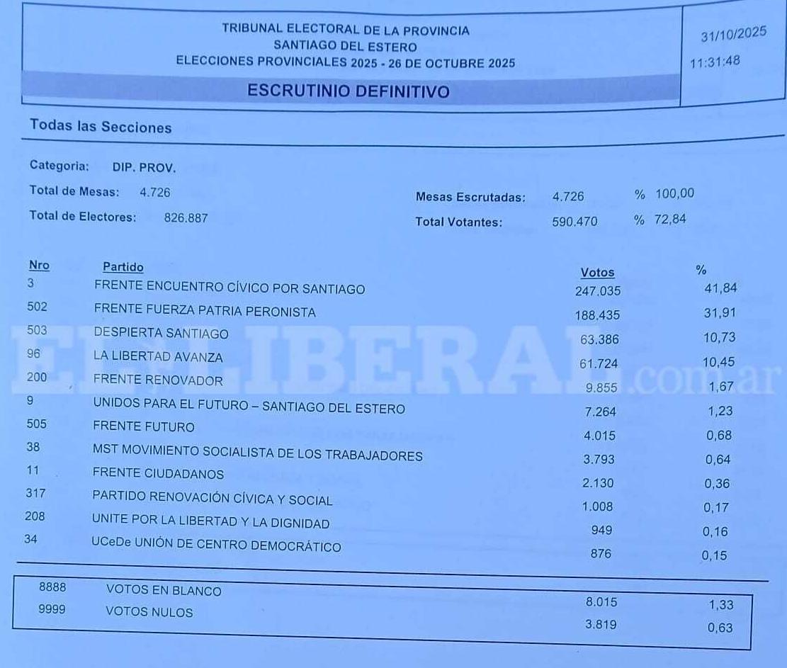 Se conoció el escrutinio definitivo: el Frente Cívico por Santiago amplió su triunfo y alcanzó el 73,8% Se conoció el escrutinio definitivo: el Frente Cívico por Santiago amplió su triunfo y alcanzó el 73,8%