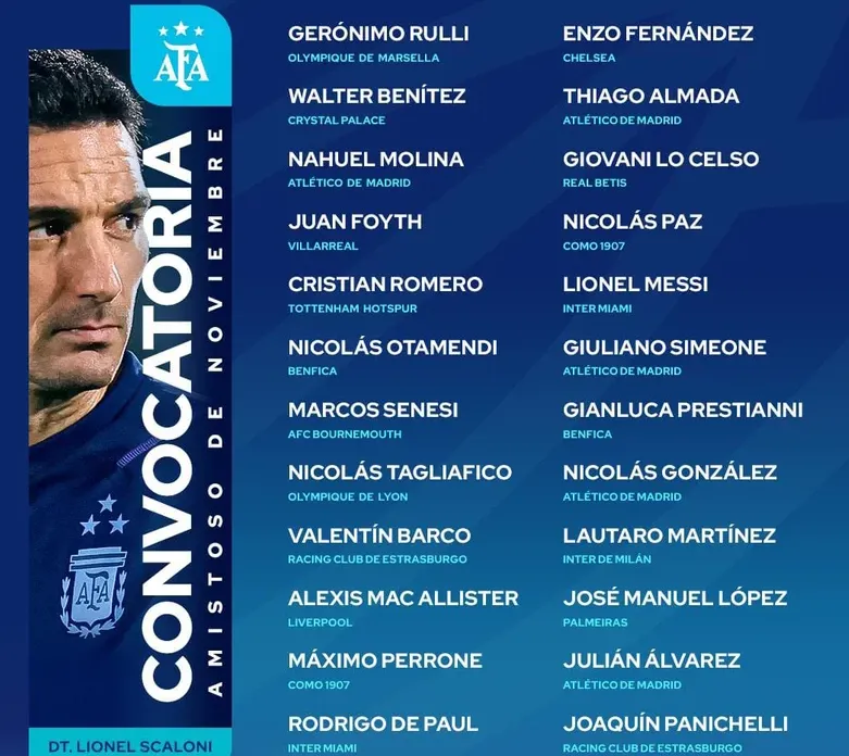 Se destaca la presencia de Lionel Messi, y algunas sorpresas como Joaquín Panichelli y Gianluca Prestianni, además de varios retornos como Valentín Barco, Máximo Perrone y Juan Foyth.