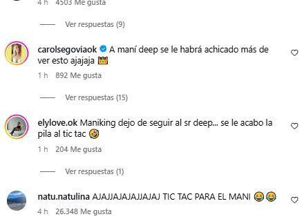"Realmente siempre consigue todo lo que quiere", "Lo quiero y lo tengo", "No te calmes nunca", "Maniking dejo de seguir al sr deep... se le acabo la pila al tic tac", fueron algunos de los comentarios que celebraron el encuentro.