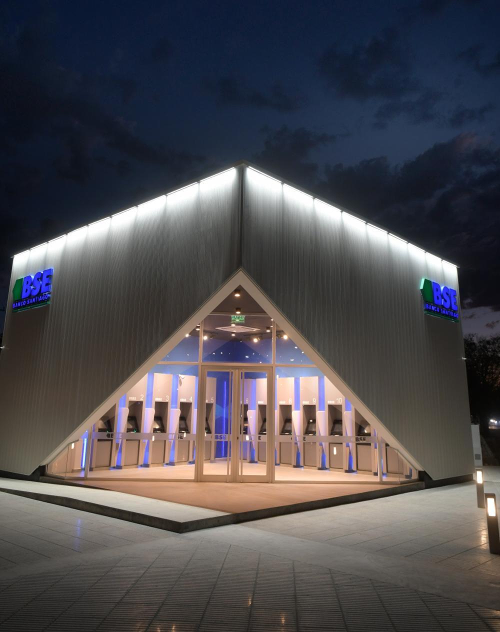 La fachada se materializa mediante revestimientos de última tecnología, con características de alta durabilidad. Durante las horas nocturnas, la iluminación arquitectónica refuerza su condición de hito urbano, otorgando presencia y visibilidad en un punto estratégico de la ciudad. El interior fue diseñado para brindar al usuario una experiencia segura y confortable, manteniendo la transparencia visual hacia el exterior y la integración con el entorno urbano. Los doce cajeros automáticos incorporan tecnología de última generación, garantizando eficiencia, accesibilidad y seguridad en la atención al público.