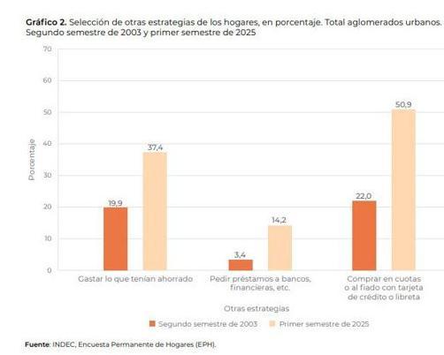 El dosier "Estrategias de manutención ¿cómo organizan su economía los hogares argentinos?" arrojó que en el primer semestre 2025: El 37,4% de los hogares recurrieron a gastar lo que tenían ahorrado. Otro 16,1% pidió préstamos a familiares/amigos. Un 14,2% pidió préstamos a financieras. A su vez, un 50,9% compró en cuotas o al fiado con tarjeta de crédito o libreta. A su turno, otro 9,3% vendió sus pertenencias