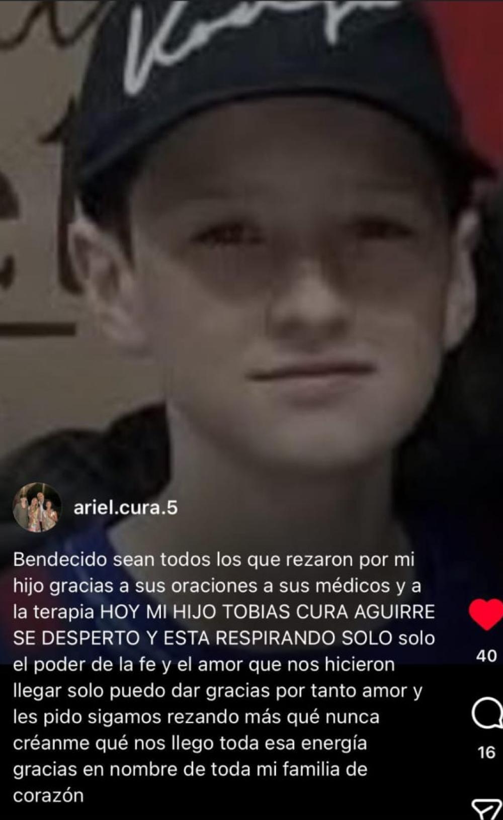 Su padre, Ariel Cura, confirmó a través de las redes sociales que el joven mostró una notable evolución en las últimas horas. Con profunda emoción, escribió: "Hoy mi hijo Tobías Cura Aguirre se despertó y está respirando solo".