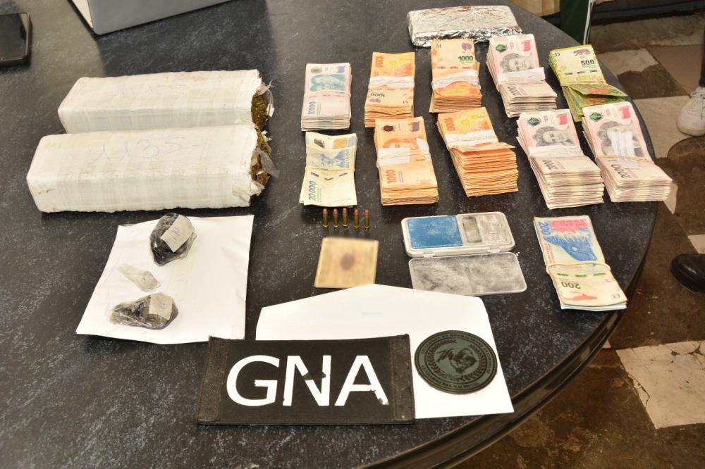 En el transcurso del día de ayer, los gendarmes se dirigieron hacia los inmuebles y procedieron a secuestrar: 1 kilo 966 gramos de cocaína, 14 kilos 472 gramos de marihuana, 75 plantas y cogollos de cannabis sativa, balanzas de precisión, elementos de fraccionamiento, equipo de iluminación para invernadero, tres armas de fuego, 94 municiones, 4.101.400 pesos argentinos, 19.080 dólares, 32 celulares, dos motos, dispositivos de almacenamiento y varias agendas con anotaciones.