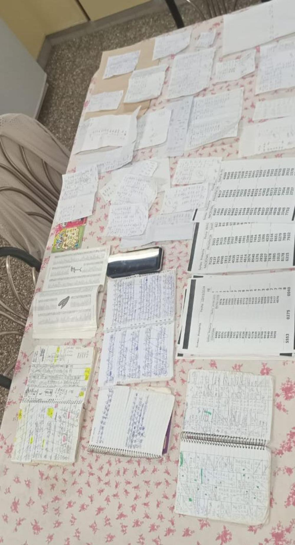 Durante la intervención en el primer domicilio se secuestró un teléfono celular, documentación con anotaciones manuscritas vinculadas a jugadas y cuadernos con registros de apuestas.