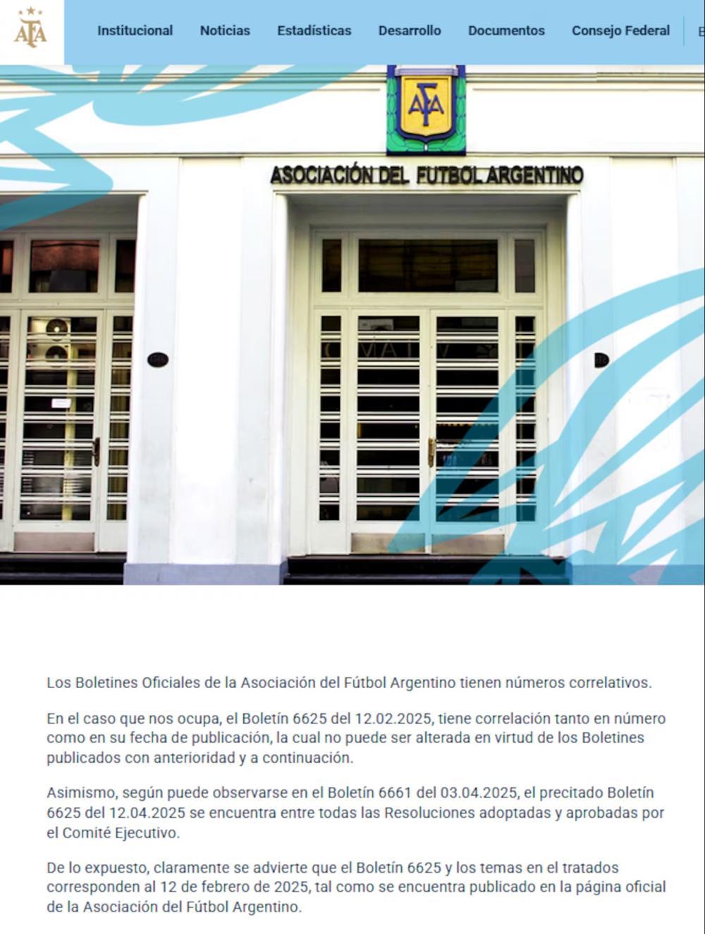 En su descargo, la AFA que preside Claudio "Chiqui" Tapia rechazó categóricamente las denuncias y aclaró que "los Boletines Oficiales de la Asociación del Fútbol Argentino tienen números correlativos y no pueden ser modificados". Las sospechas surgieron porque varios usuarios en redes sociales detectaron que el Boletín 6625, fechado el 12 de febrero de 2025 y publicado en el sitio oficial, aparecía con fecha de creación del documento PDF correspondiente al domingo 23 de noviembre.