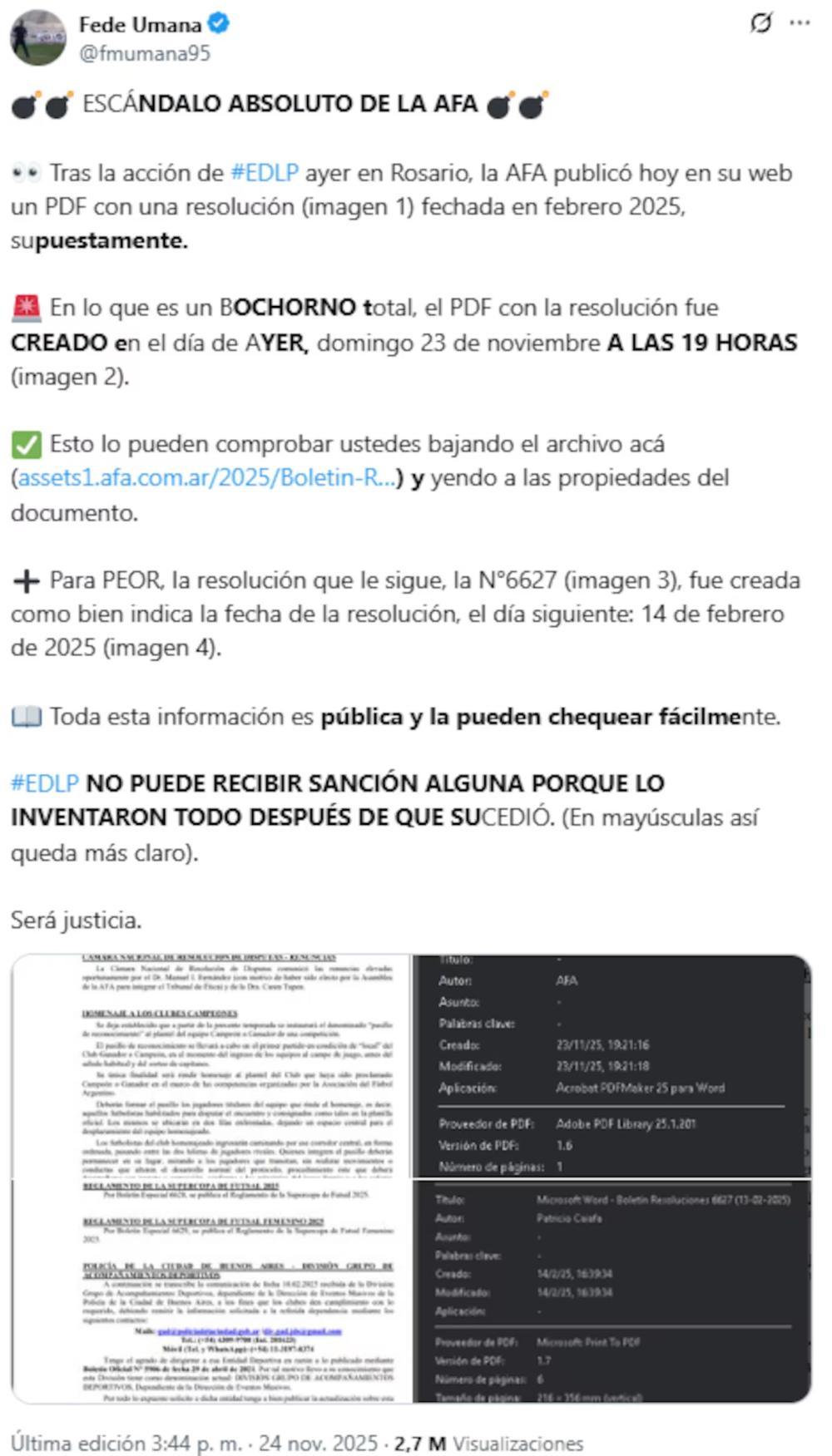 Las dudas se multiplicaron en X (ex Twitter), donde usuarios entre ellos @fmumana95 mostraron capturas en las que el PDF descargado del sitio oficial indicaba que había sido creado el 23 de noviembre, pocas horas después del polémico gesto del Pincha.