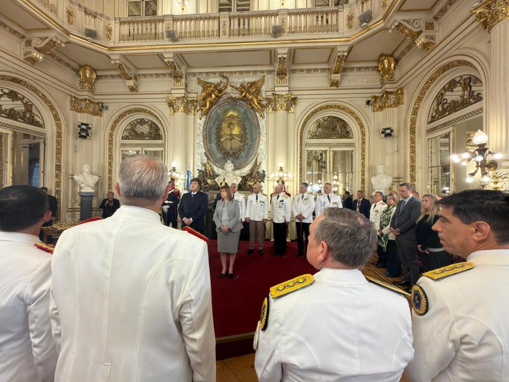 El presidente Javier Milei presidió esta mañana la entrega de sables y bastones de mando a oficiales superiores de la Prefectura Naval, de la Policía Federal, de la Gendarmería Nacional, de la Policía de Seguridad Aeroportuaria (PSA) y del Servicio Penitenciario Federal, en el Salón Blanco de la Casa Rosada.