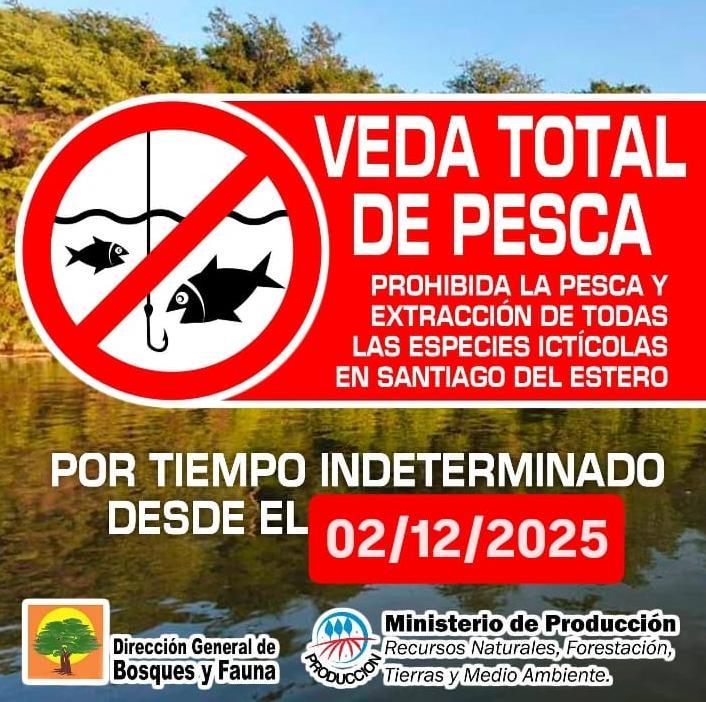 A partir de este martes 2 de diciembre, en toda la provincia de Santiago del Estero comenzó a regir una veda total de pesca, que se extenderá en principio hasta el 15 de enero de 2026, con posibilidad de prórroga. La medida fue dispuesta por la Dirección General de Bosques y Fauna y apunta a proteger a las especies ictícolas durante su período reproductivo.