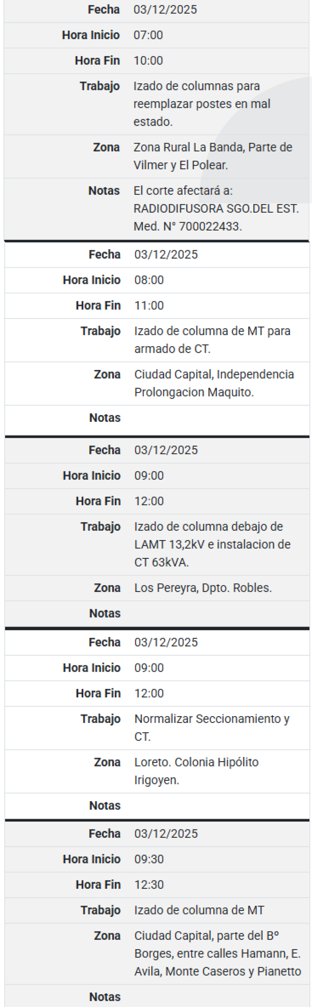 Este miércoles 3 de diciembre se realizarán cortes programados de energía eléctrica en la ciudad de Santiago del Estero. La medida forma parte de tareas de mantenimiento y trabajos técnicos que la empresa distribuidora ejecutará para mejorar el servicio en distintos sectores de la Capital.