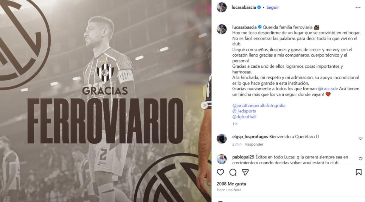 Central Córdoba despidió este jueves a uno de los grandes referentes de su plantel en el último tiempo. Lucas Abascia, defensor, líder dentro y fuera de la cancha y uno de los capitanes del equipo, confirmó su salida del club y continuará su carrera en el fútbol de México, luego de un ciclo de un año y medio que dejó una huella profunda en el corazón del hincha ferroviario.