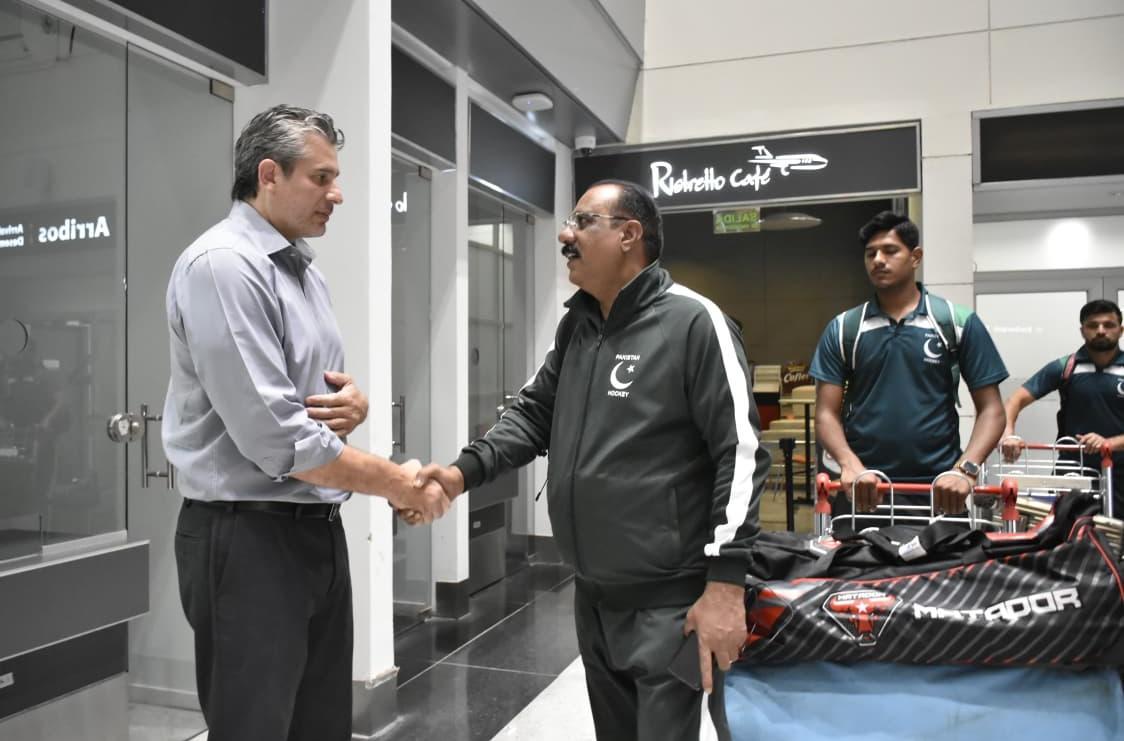 La selección masculina de hockey sobre césped de Pakistán arribó a Santiago del Estero en la noche del jueves y fue recibida en el aeropuerto Internacional de Termas de Río Hondo por el subsecretario de Turismo, Nelson Bravo, quien les dio la bienvenida en nombre de la provincia.