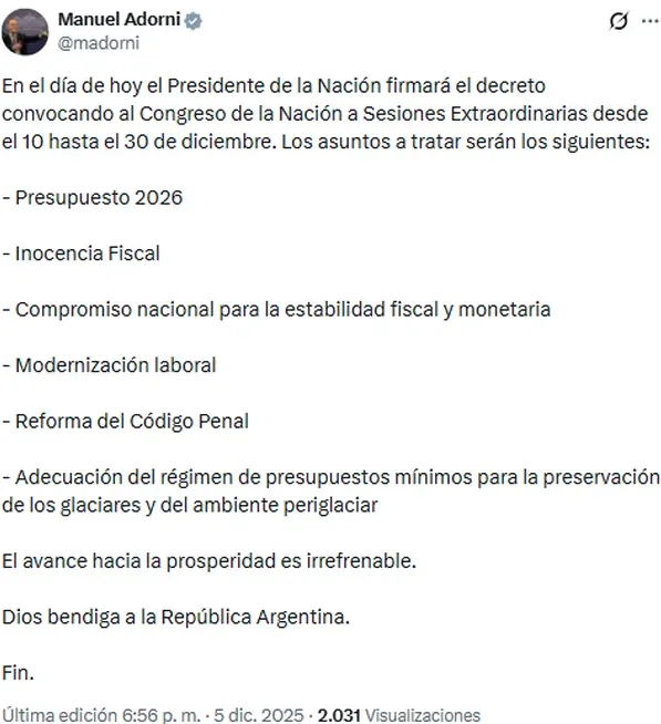 A través de sus redes sociales, Manuel Adorni -jefe de Gabinete y aún vocero presidencial- se encargó de confirmar que "en el día de hoy el Presidente de la Nación firmará el decreto convocando al Congreso de la Nación a sesiones extraordinarias desde el 10 hasta el 30 de diciembre".