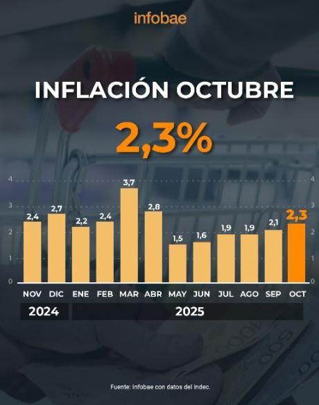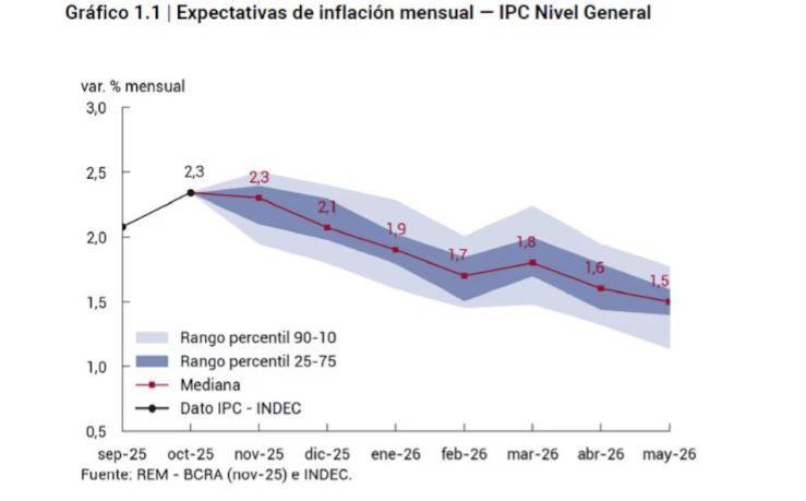 El último Relevamiento de Expectativas de Mercado (REM) del Banco Central señala que la inflación prevista para noviembre se ubica en 2,3%, lo que implica un incremento respecto del informe previo. El grupo "Top 10", que suele acercarse más a los resultados reales, proyecta un porcentaje similar. Para diciembre de 2025, las consultoras estiman una inflación de 2,1% y anticipan que el IPC recién quebrará el 2% en enero de 2026. Hacia mayo, podría alcanzar el 1,5%, en un contexto de menor aceleración de precios.