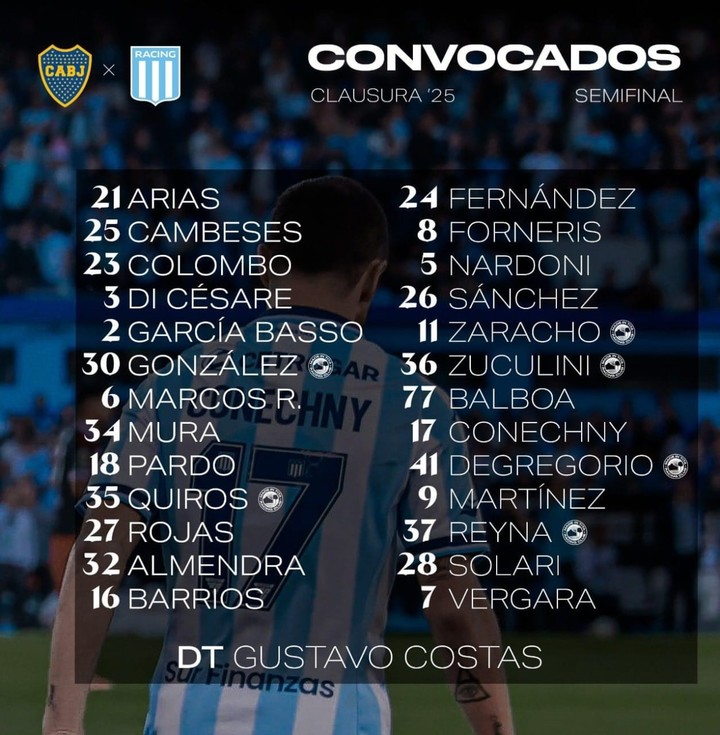 Probable formación de Racing vs. Boca: Facundo Cambeses; Marco Di Césare, Nazareno Colombo, Agustín García Basso; Facundo Mura, Juan Nardoni, Agustín Almendra, Gabriel Rojas; Santiago Solari, Adrián Martínez y Duván Vergara. DT: Gustavo Costas.