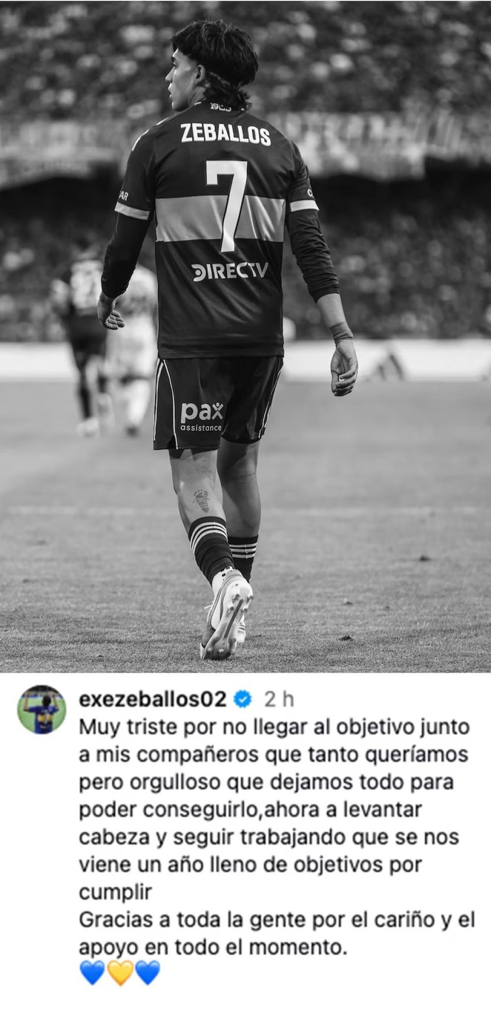Zeballos también tuvo palabras para los hinchas xeneizes: "Gracias a toda la gente por el cariño y el apoyo en todo momento", y dejó un mensaje de resiliencia de cara al futuro: "Orgulloso de que dejamos todo para poder conseguirlo, ahora a levantar cabeza y seguir trabajando que se nos viene un año lleno de objetivos por cumplir".