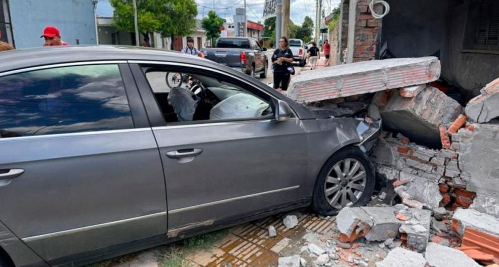A causa del brutal impacto, el Volkswagen Passat se subió a la vereda y se estrelló contra el frente de una vivienda propiedad de la familia Hoyos quedando incrustado entre los escombros y causando graves daños.