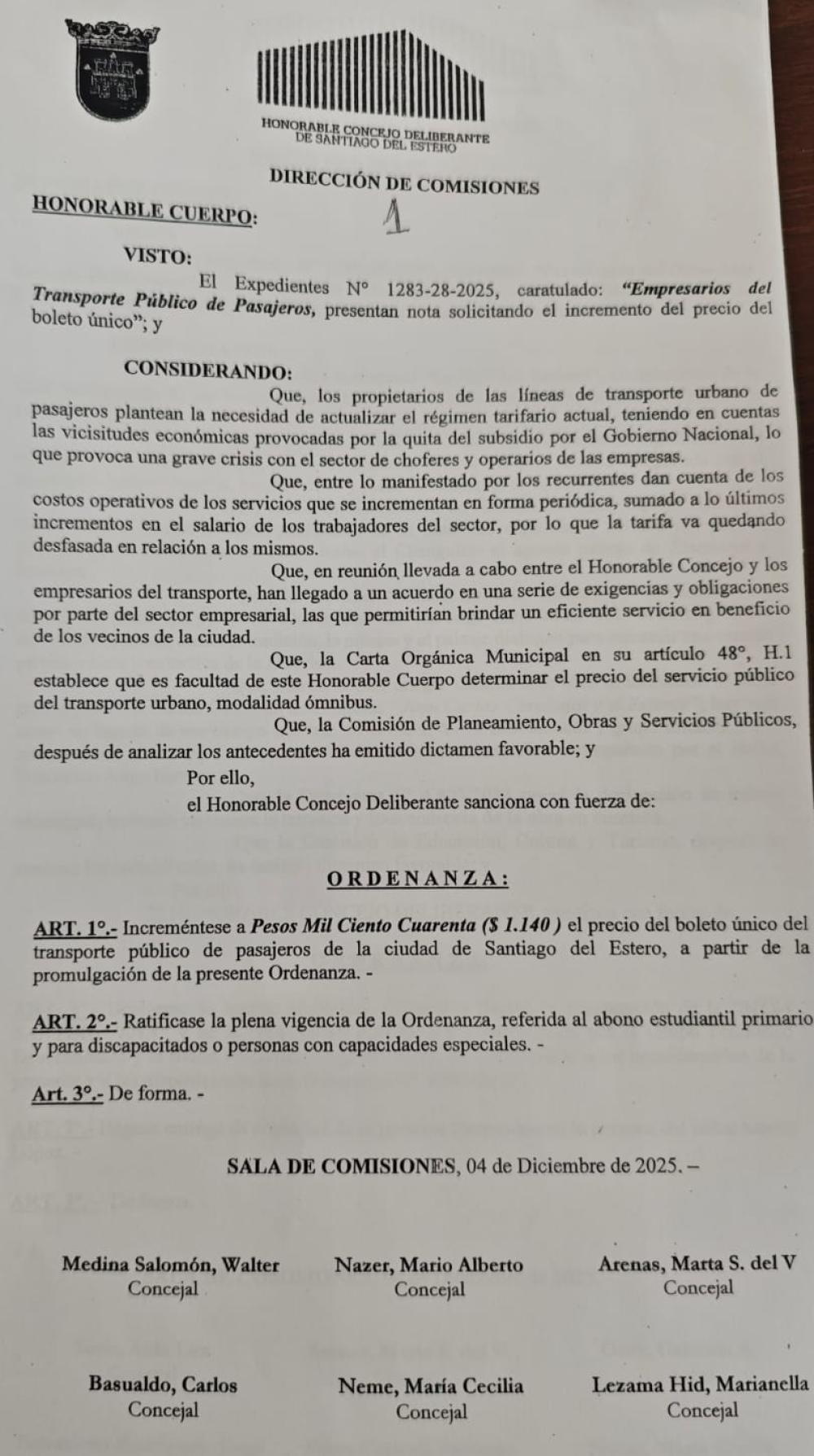 Hace instantes, el Honorable Concejo Deliberante de la ciudad de Santiago del Estero aprobó el aumento del boleto único de colectivo a $1.140, un 34% más que los $850 anteriores.