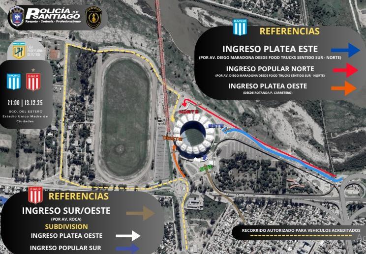 De cara a la gran final entre Racing Club y Estudiantes de La Plata, que se disputará este sábado 13 de diciembre a las 21:00 en el Estadio Único Madre de Ciudades, la Policía de la Provincia dio a conocer el mapa oficial con la organización de ingresos y circulación para facilitar el acceso del público y garantizar la seguridad.