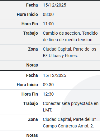 Este lunes 15 de diciembre se realizarán cortes programados de energía eléctrica en Santiago del Estero. La medida forma parte de tareas de mantenimiento y trabajos técnicos que la empresa distribuidora ejecutará para mejorar el servicio en distintos sectores de la provincia.