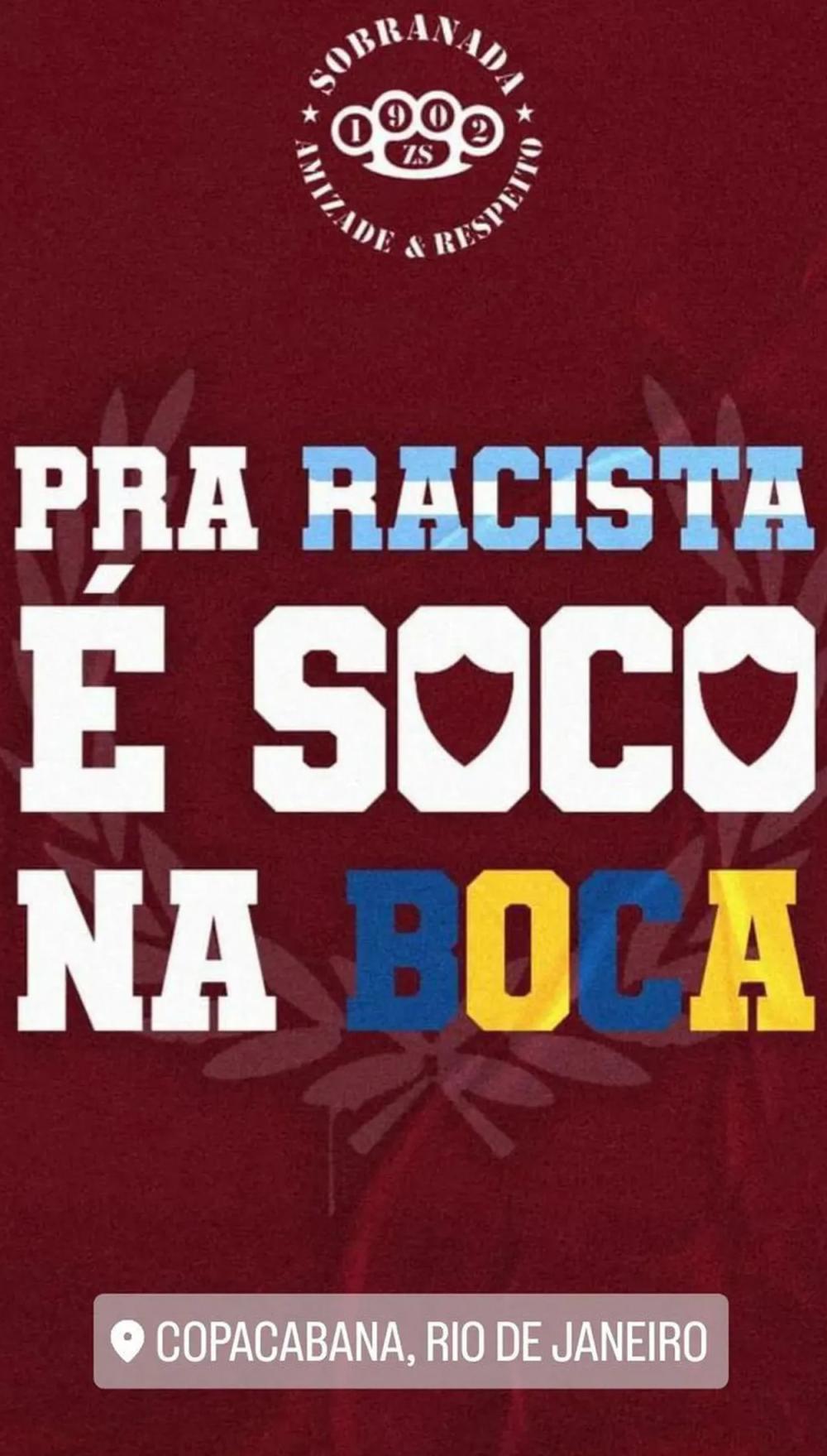 "Sobranada", una de las barras oficiales del "Flu" y que suele ser protagonista de disturbios y peleas, amenazó a hinchas de Boca a través de su perfil de Instagram. "Pra RACISTAS, é soco na BOCA", se lee en la publicación, en donde la palabra "racistas" en letras celeste y blancas y "Boca" con sus colores característicos.
