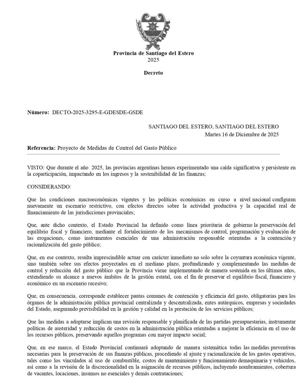 Tal como lo había adelantado en su mensaje de asunción, el gobernador de Santiago del Estero, Elías Suárez, firmó un decreto que establece un régimen integral de control y contención del gasto público, el cual tendrá vigencia a partir del 10 de diciembre de 2025 y por el plazo de 12 meses, con posibilidad de prórroga por idéntico período.