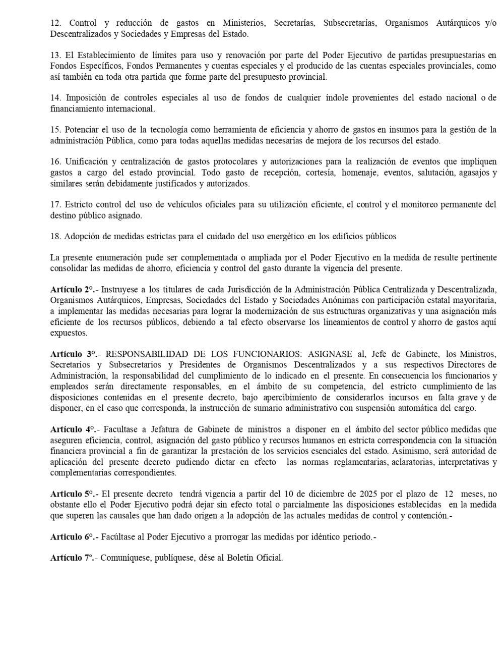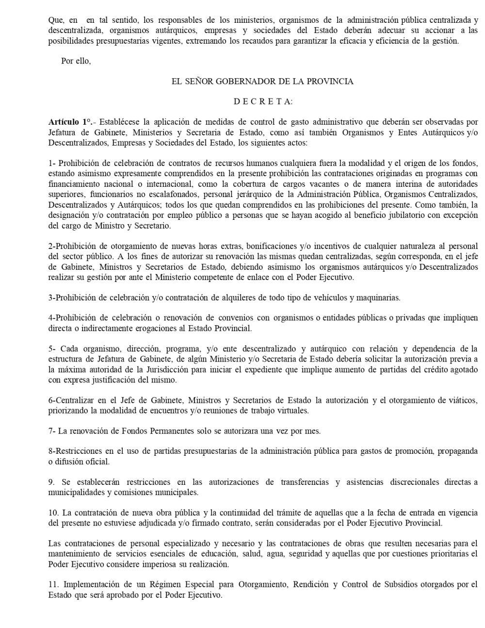 Además, se dispone la prohibición de alquilar vehículos y maquinarias, así como la celebración o renovación de convenios con entidades públicas o privadas que impliquen erogaciones para el Estado provincial.