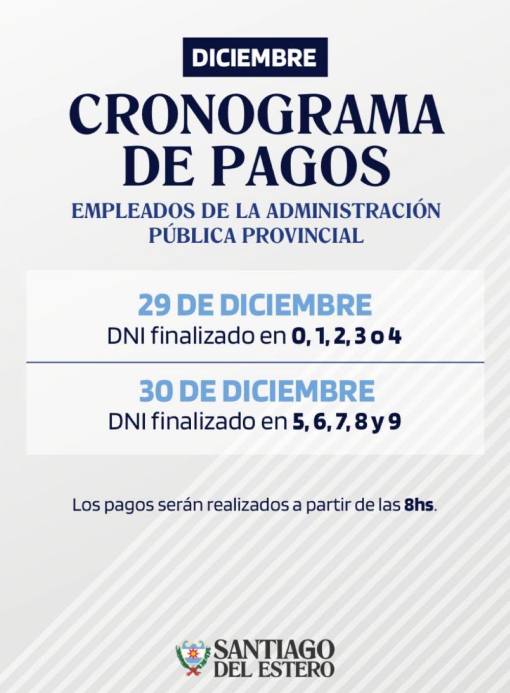 El Ministerio de Economía informa que el próximo Lunes 29 y Martes 30, a partir de las 8 hs, se hará efectivo el pago de haberes correspondientes a diciembre a todos los agentes de la administración pública provincial.