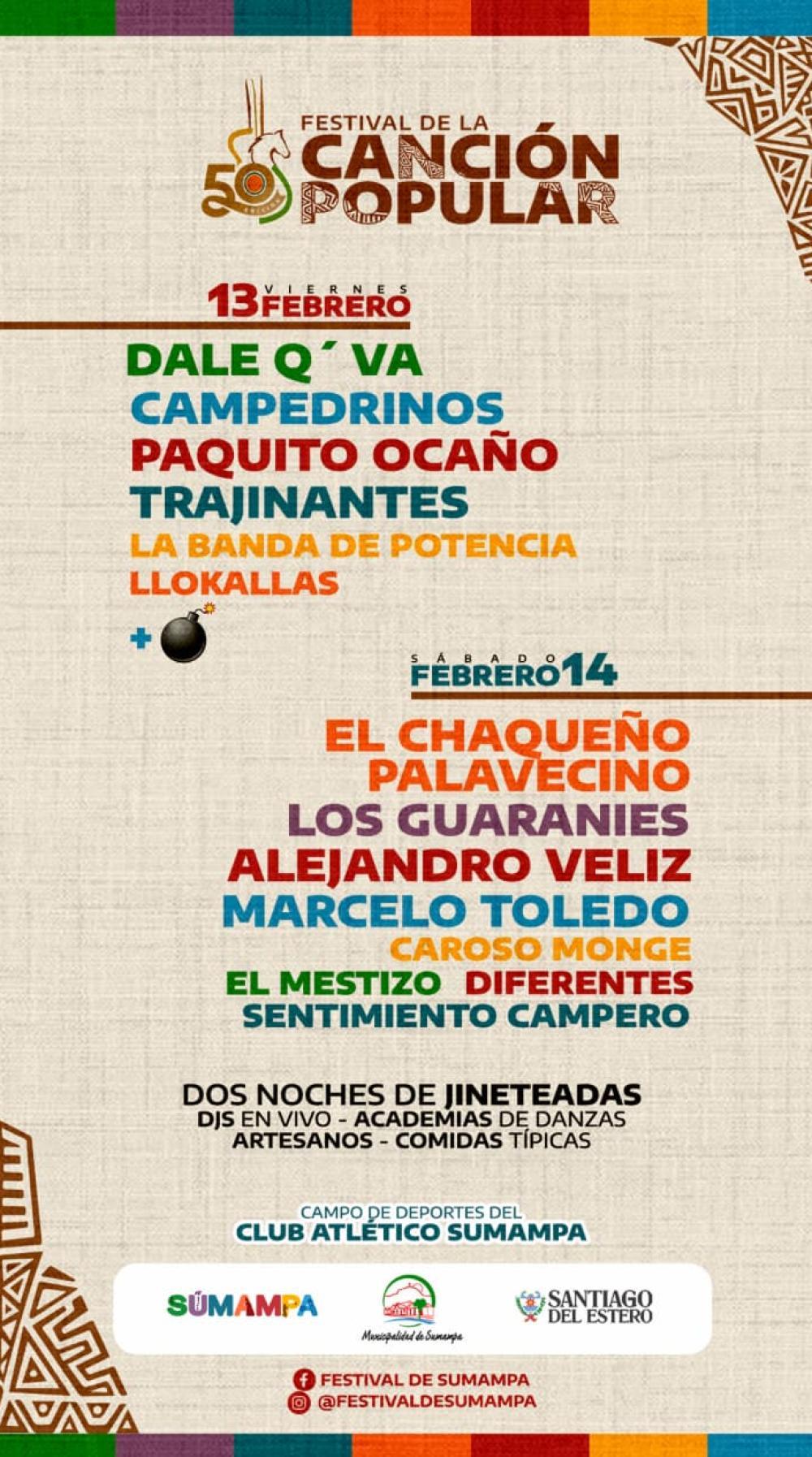 La ciudad de Sumampa se alista para una nueva edición del Festival de la Canción Popular, uno de los encuentros culturales más tradicionales del sur santiagueño, que en 2026 celebrará su 50° aniversario con dos noches cargadas de música, danza y tradición.