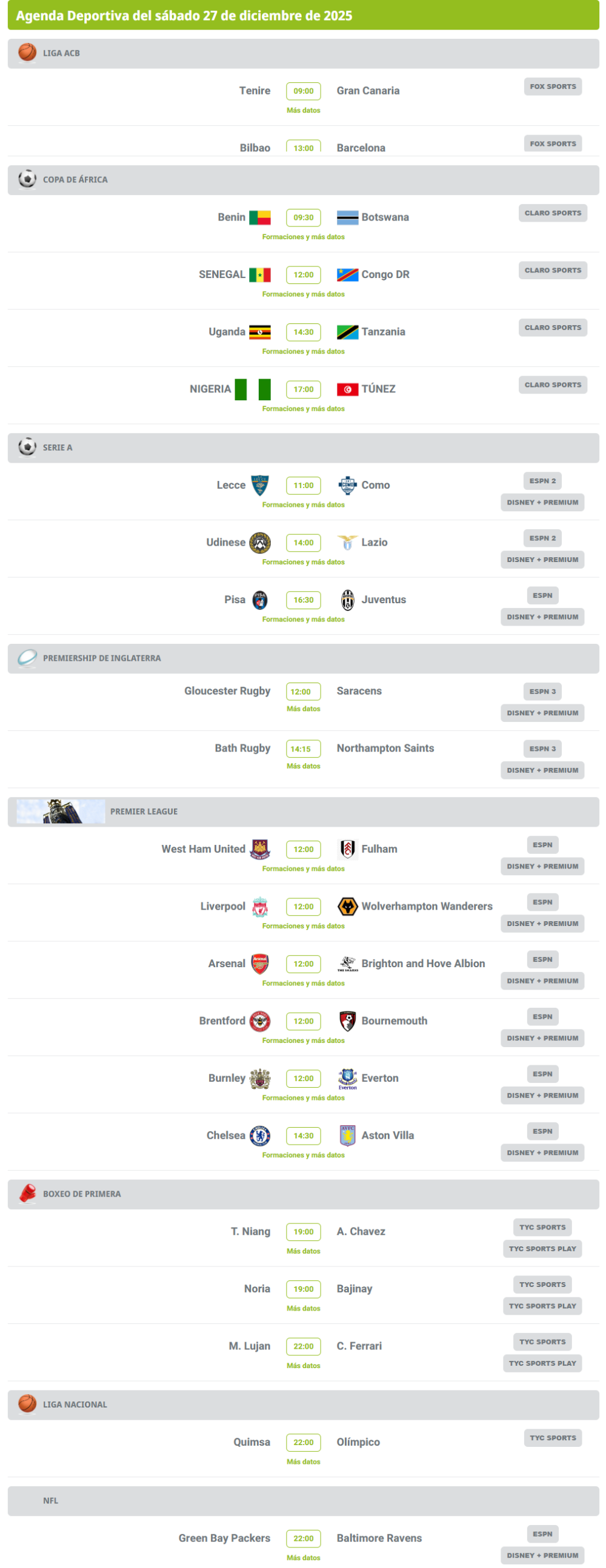 Agenda deportiva: hora y dónde ver los partidos de este 27 de diciembre Agenda deportiva: hora y dónde ver los partidos de este 27 de diciembre