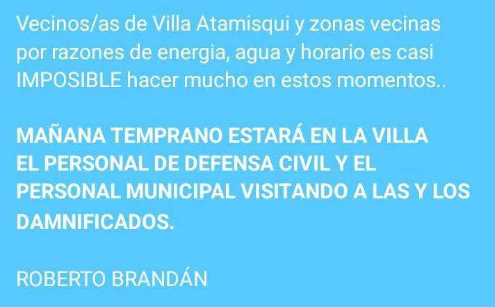 Vecinos/as de Villa Atamisqui y zonas vecinas, por razones de energía, agua y horrio es casi imposible hacer mucho en estos momentos. Mañana temprano estar{a en la Villa el personal de Defensa Civil y el personal municipal visitando a las y los damnificados.